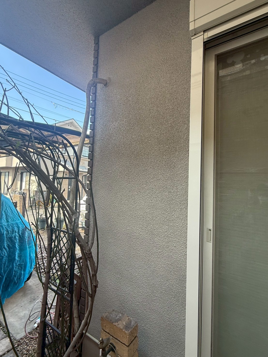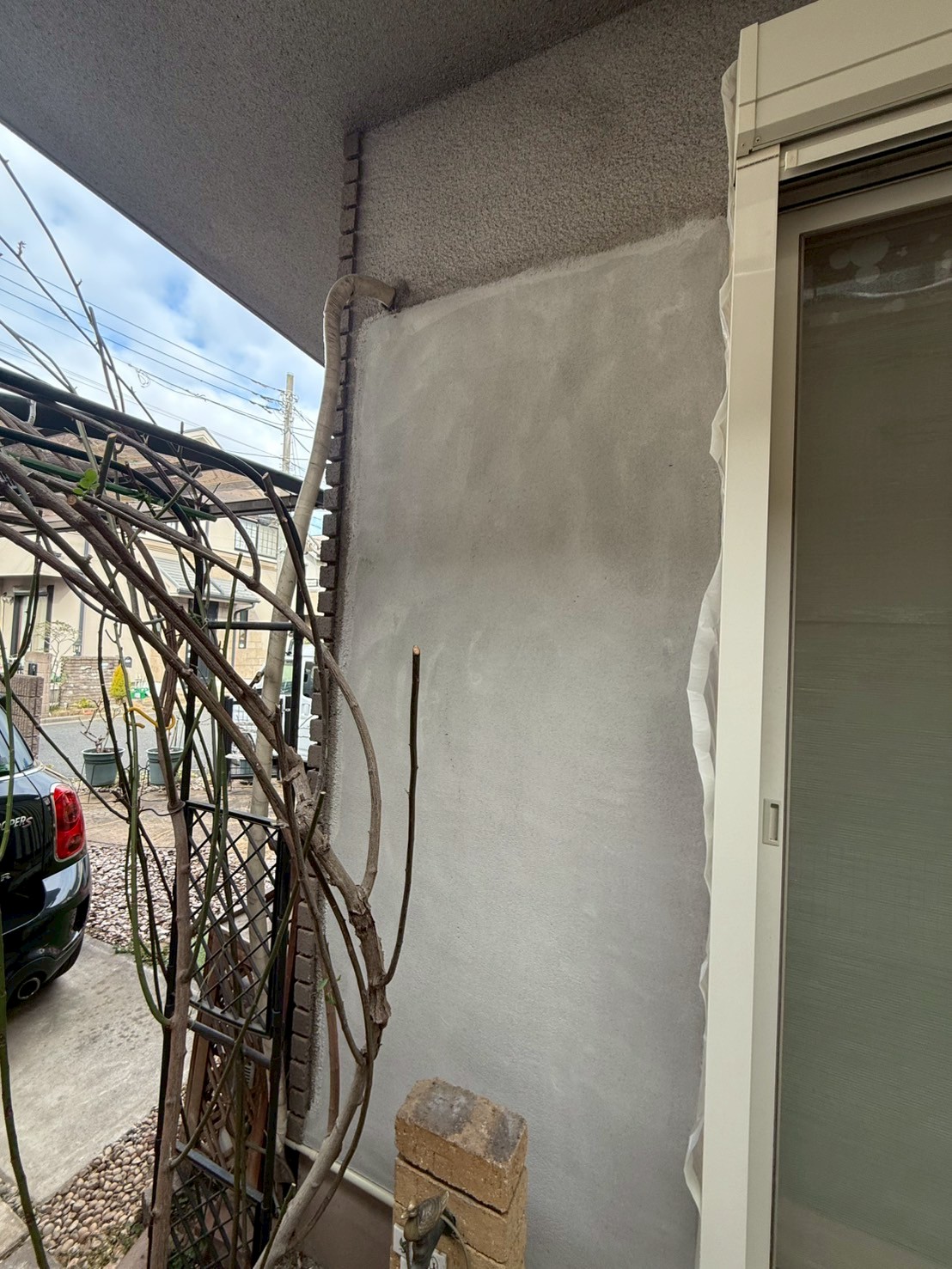 補修後は既存外壁の仕上げに合わせ、下地調整のうえ、ソフトリシンによる吹付塗装を行い、周囲の外壁と違和感が出ないよう仕上げました。