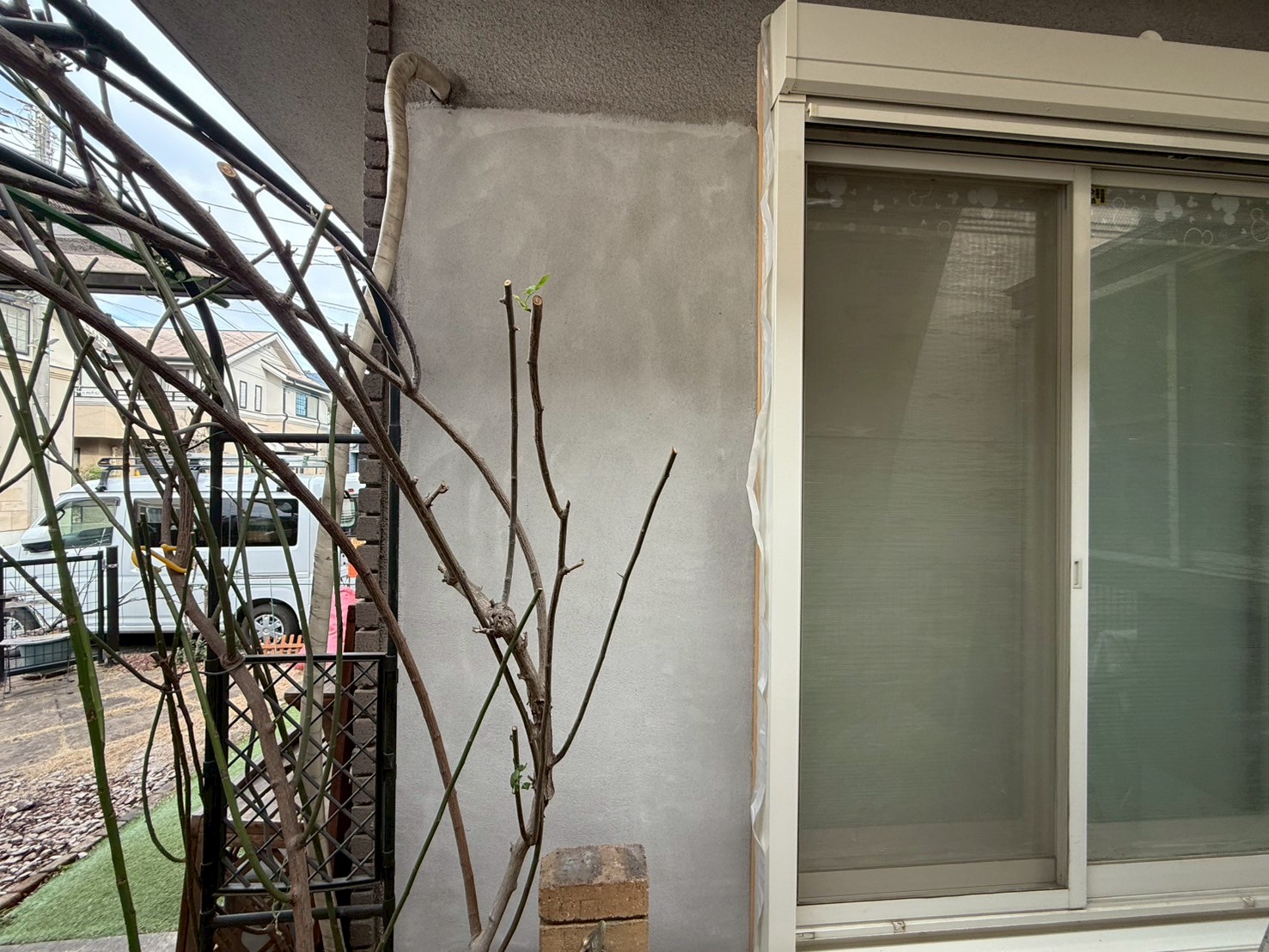題名 外壁補修吹付工事 場所 東京都小平市 施工内容 外壁補修吹付工事 使用材料 水性ミラクシーラーエコ レナラック ソフトリシン 保証期間 コメント 小平市にて外壁補修吹付工事を実施いたしました。雨戸からシャッターへ変更したことに伴い、既存の戸袋部分を撤去し、モルタルにて下地補修を行っています。 補修後は既存外壁の仕上げに合わせ、下地調整のうえ、ソフトリシンによる吹付塗装を行い、周囲の外壁と違和感が出ないよう仕上げました。 既存外壁の意匠を損なわないよう配慮しながら施工し、建物の美観を維持した補修工事となっています。