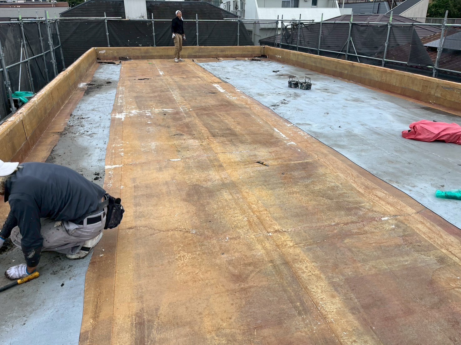 屋上防水についてはウレタン防水通気緩衝工法を採用し、通気緩衝シートおよび脱気装置を設置することで、防水層内部に滞留する湿気を排出し、防水層の膨れを抑制する仕様としました。バルコニーはウレタン防水密着工法にて施工し、既存下地の状況に応じた防水改修を行っています。