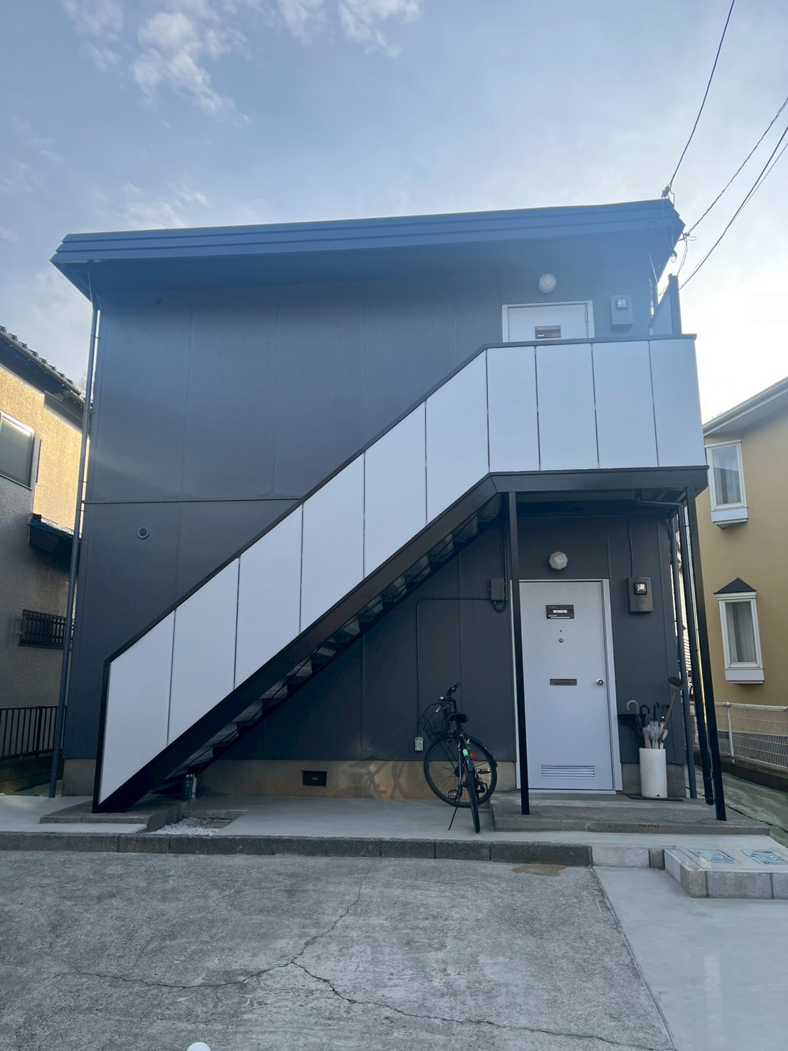 Uアパートにて外装修繕工事を実施いたしました。外壁塗装をはじめ、折半屋根塗装·付帯部塗装·シーリング工事を行い、建物全体の保護性能と美観の回復を図っています。